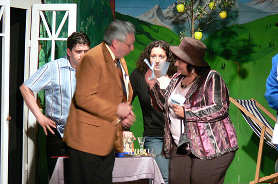 Aber was nützen gute Absichten, wenn die Mittel fehlen. Neben dem Geld fehlt dem Direktor auch ein Darsteller. Um beides zu bekommen, muss er mit seiner Gruppe erst mal im wirklichen Leben ein wenig „Theater“ spielen. Auf diese Weise entlocken die „Schauspieler“ einer Sponsorin Geld, für das sie dann einen Künstler als Zugnummer engagieren. Der entpuppt sich jedoch eher als ein Selbstdarsteller, der nur dank seiner Ehefrau und Managerin hoch im Kurs ist.